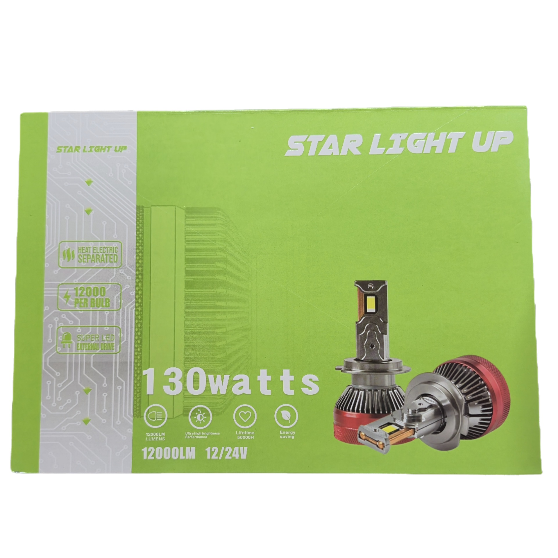 هدلایت 130 وات استارلایت آپ | STARLIGHT UP 130W HEADLIGHT شدت نور 12,000 لومن موجود در دو پایه H7 و H4 طول عمر 50,000 ساعت سیستم فن خنک کننده قوی الگوی پرتو نور استاندارد تمرکز پرتو نور دقیق راندمان بالا و پایدار به منظور آسودگی خیال شما مشتریان عزیزاین محصول دارای گارانتی یک ساله بی قید و شرط شرکتی میباشد.